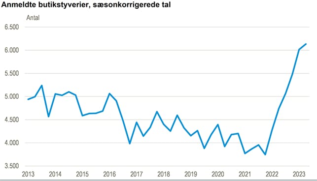 De nyeste tal fra Danmarks Statistik viser, at antallet af anmeldte butikstyverier i andet kvartal 2023 fortsat er for opadgående. Det er nu sjette kvartal i streg. Antallet af anmeldte butikstyverier har ikke været højere siden 2001.