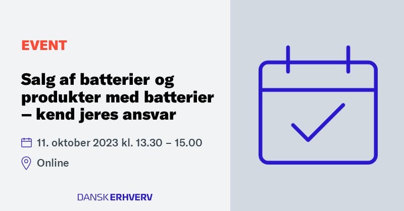Dansk Erhverv har inviteret Miljøministeriet og Sikkerhedsstyrelsen til at komme og fortælle om de nye krav i batteriforordningen. Deltag og får styr på hvad kravene er til jer. Webinaret finder sted onsdag d. 11. oktober kl. 13.30 – 15.00