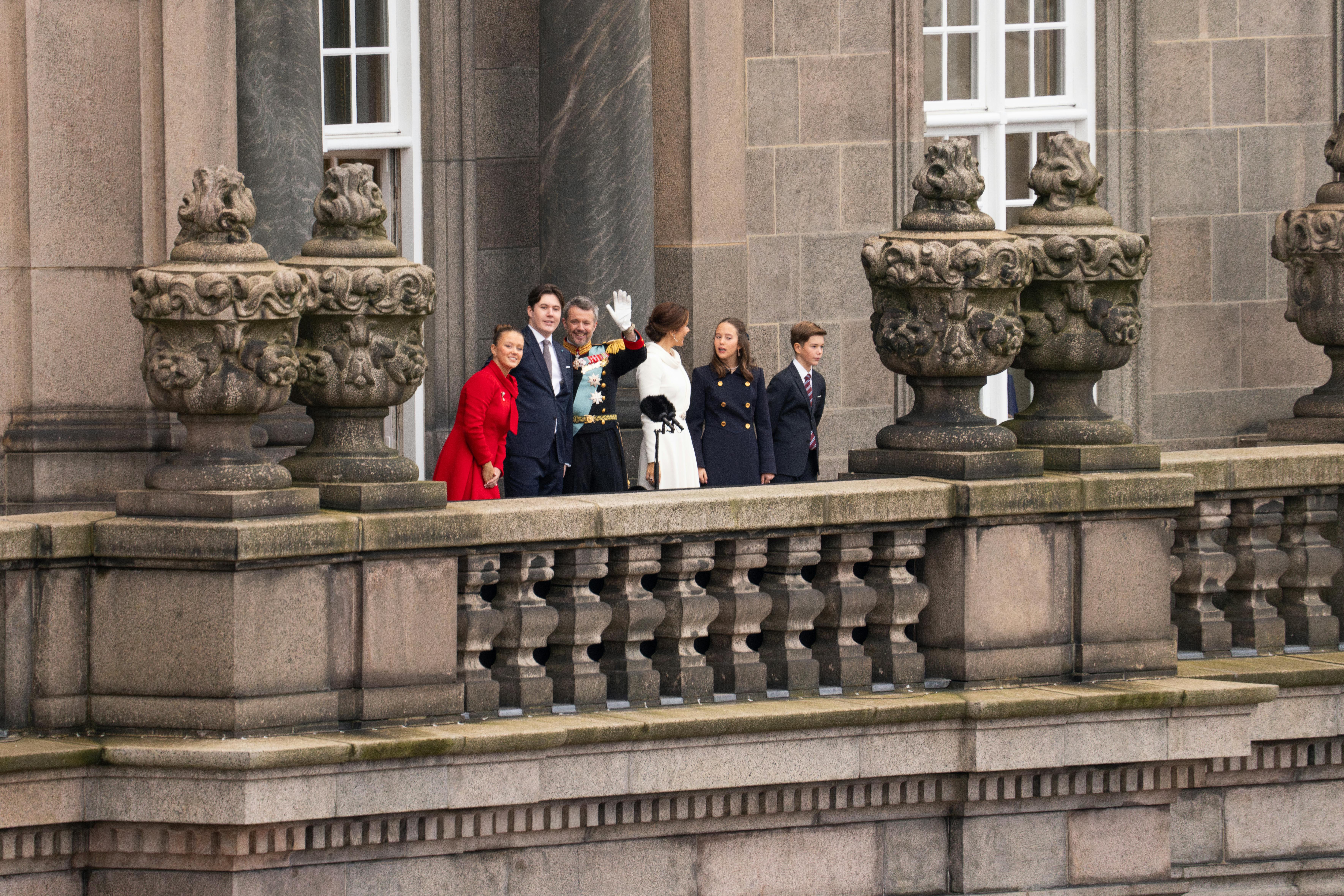 Hele familien var med, da Hans Majestæt Kong Frederik 10. modtog folkets hyldest på Christiansborg Slotsplads. Til venstre ses prinsesse Isabella og kronprins Christian og til venstre for kongeparret prins Vincent og prinsesse Josephine.