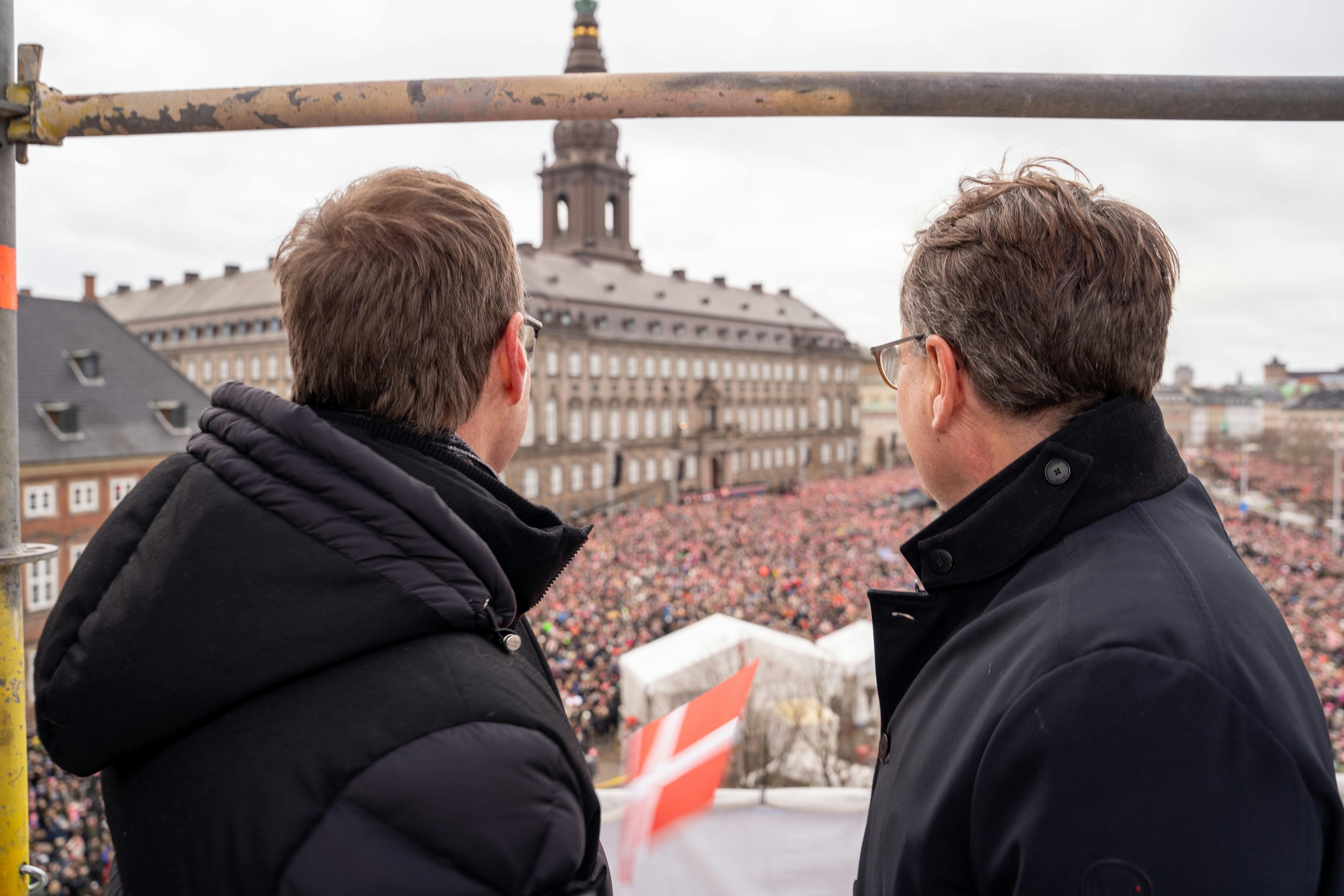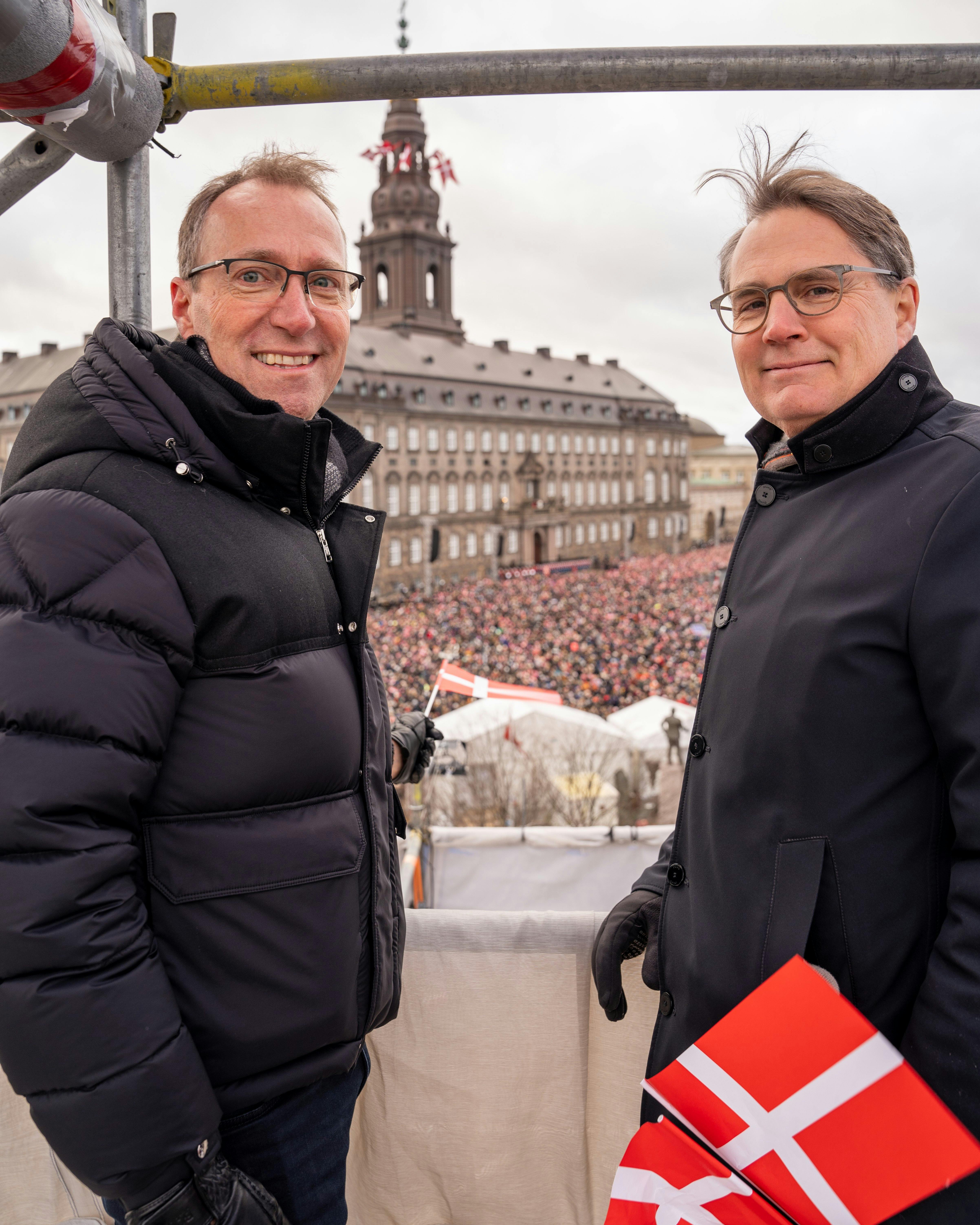 Fra stilladset på Børsen skuer adm. direktør Brian Mikkelsen og bestyrelsesformand Jens Mathiesen ud over den imponerende folkemængde, der søndag samlede sig på Christiansborgs Slotsplads.