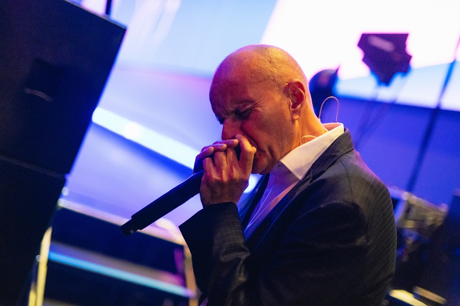 E-handelsdirektør Niels Ralund banker showet i gang med en mundharmonika-solo. Rygtet går på, at det er den længste tale-pause, Niels Ralund har holdt siden 1992.