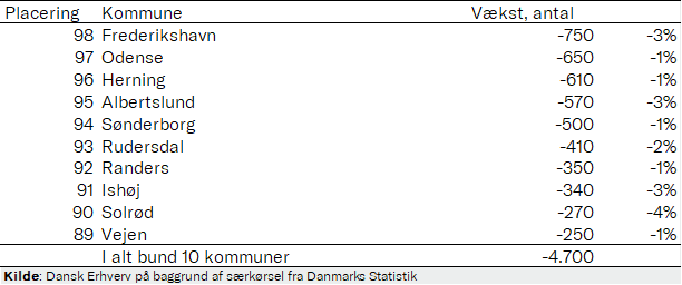 10 danske kommuner med mindst fremgang i lønmodtagerbeskæftigelsen det seneste år