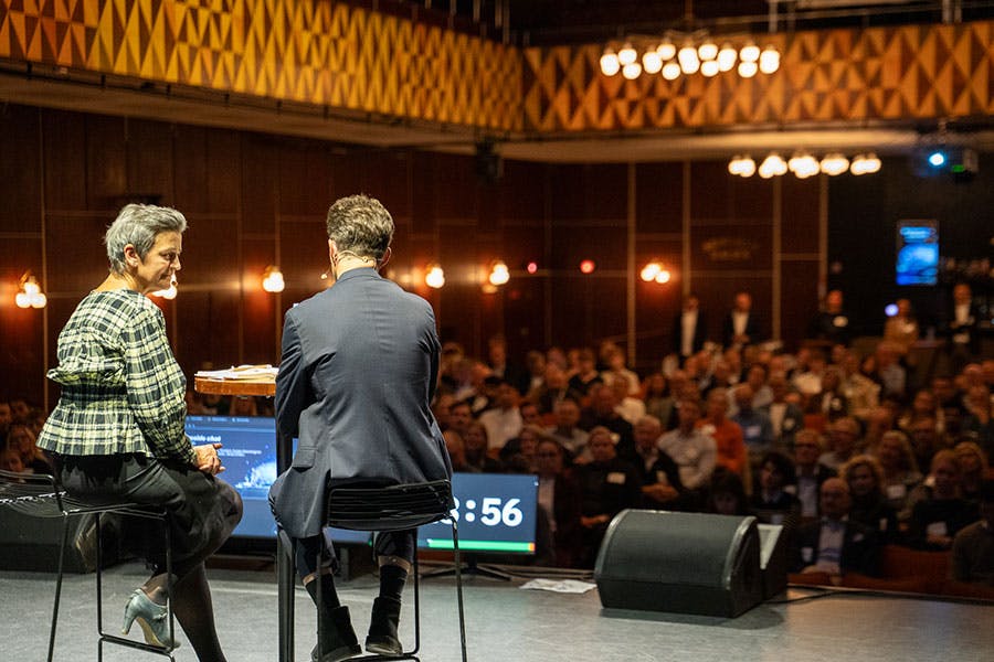 Det er en hyperpolitisk virkelighed, som erhvervslivet skal forholde sig til i 2024. Det tema udfoldede Margrethe Vestager, afgående ledende næstformand i EU-Kommissionen og kommissær for konkurrence i en fireside-chat med Nikolaj Juncher Wædegaard, vicedirektør i Dansk Erhverv. Det var en spændende samtale om Europas konkurrenceevne, den nye verdensorden og industripolitikkens renæssance.
