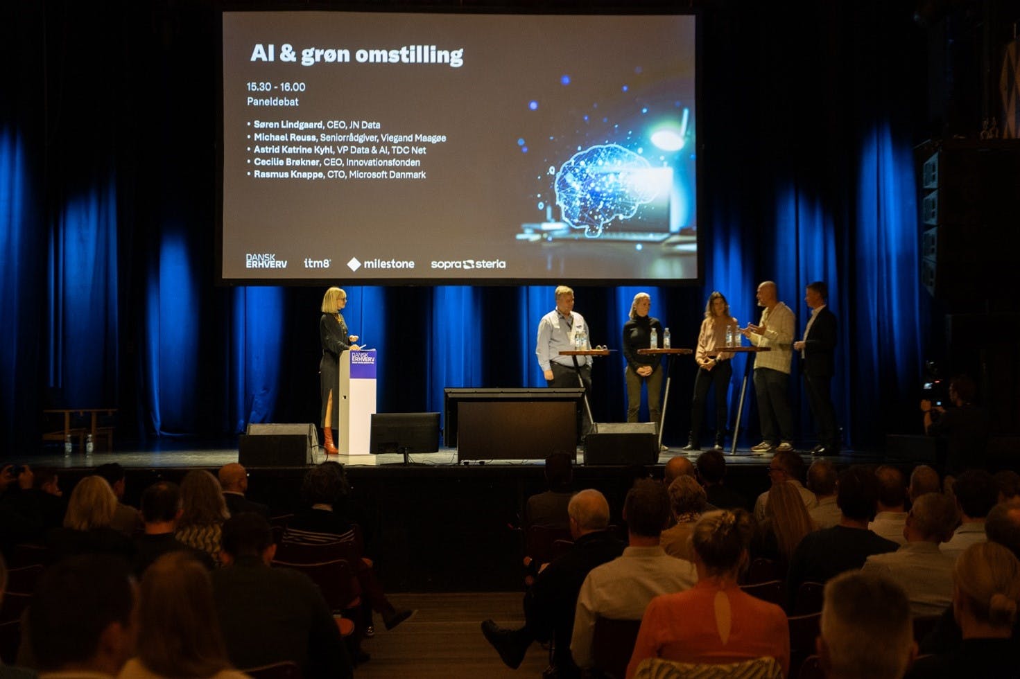 På scenen blev der diskuteret AI i lyset af den grønne omstilling. For teknologien skal være med til at løse nogle af de store samfundsudfordringer som grøn omstilling. Men kan teknologiens energiforbrug samtidig være en del af problemet?