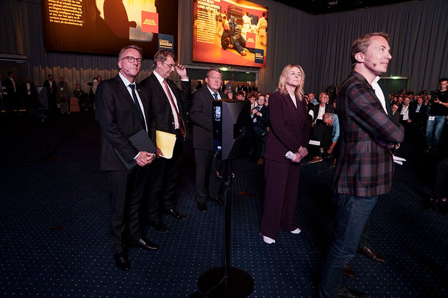 Margrethe Vestager på forreste række sammen med Morten Langager, Brian Mikkelsen, Troels Lund Poulsen og Jens Mathiesen.