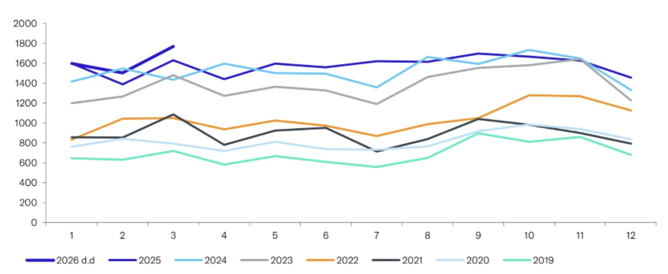2025 endte på et historisk højt niveau med 18.885 registrerede butikstyverier i Crimestat med et månedligt gennemsnit på 1.574 tilfælde. De første tre måneder af 2026 ligger allerede over dette niveau med et gennemsnit på 1.613 butikstyverier om måneden. Uden nye og effektive tiltag vurderer Dansk Erhverv derfor, at årets samlede niveau igen kan ende på over 18.000 registrerede butikstyverier.