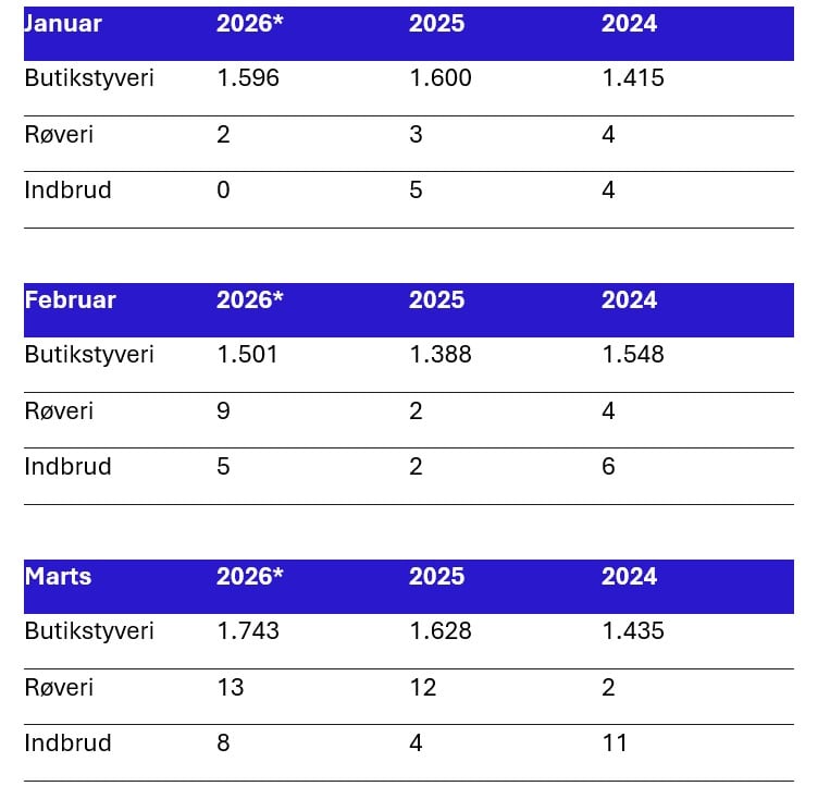 Tal fra Crimestat viser, at at den bekymrende udvikling i antallet af butikstyverier røverier og indbrud fortsætter. I januar 2025 blev der registreret rekordmange butikstyverier.