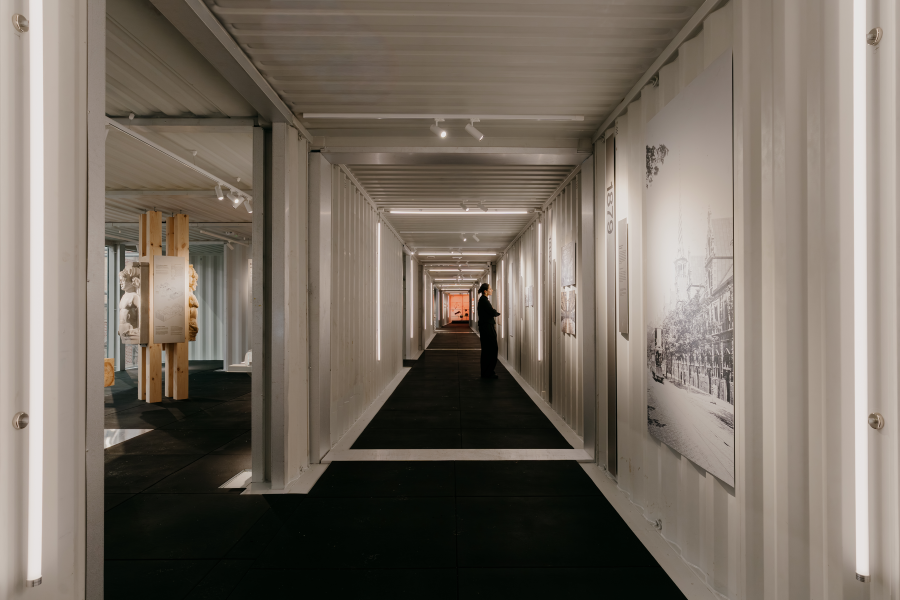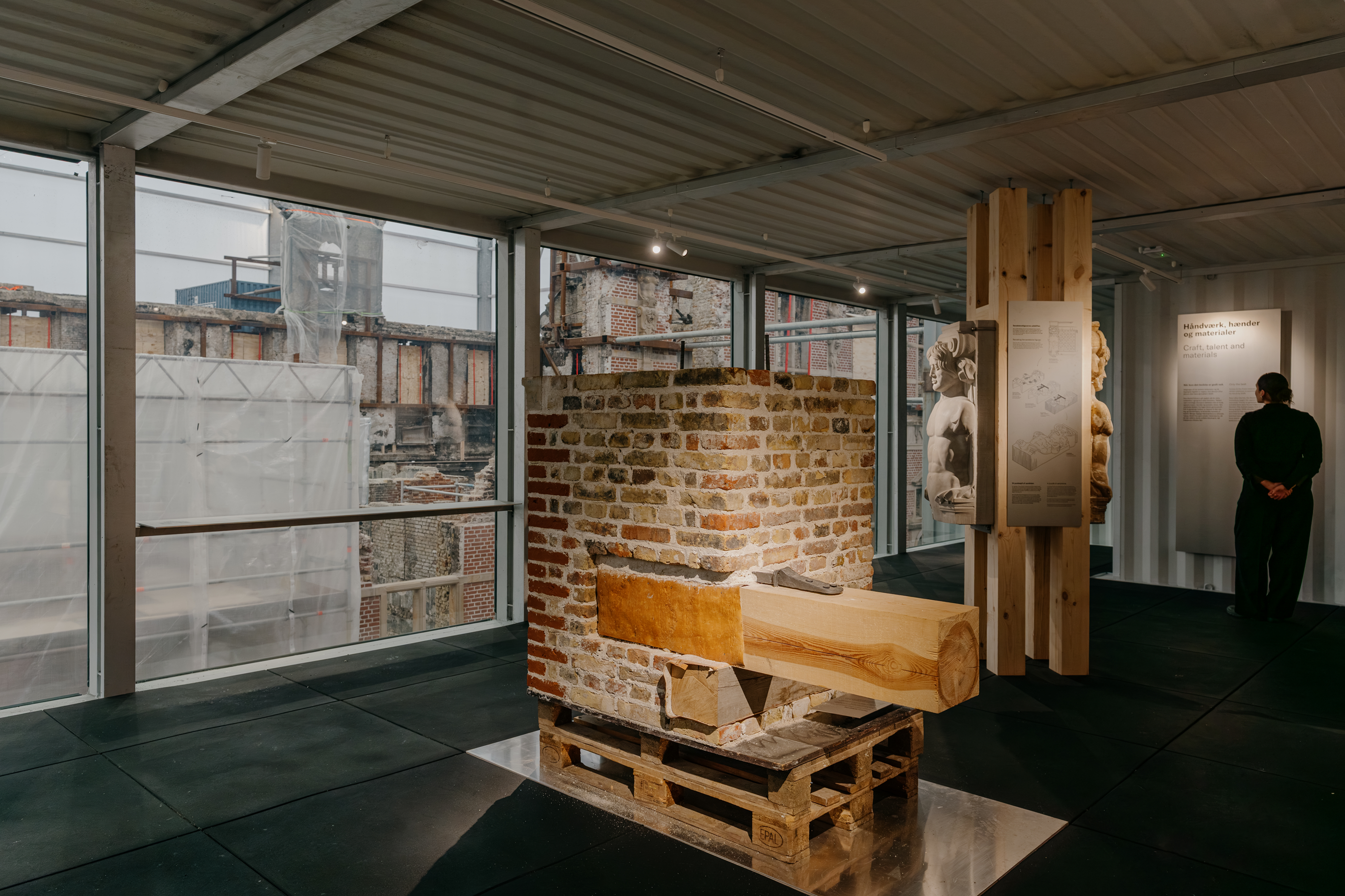 Udstillingen består af et besøgscenter med 15 sammenbyggede containere i første sals højde, der giver et unikt kig ind over byggepladsen. En række fysiske genstande bringes i spil; lige fra nyhuggede sandstensfigurer til 4oo år gamle blykugler. Desuden vises nyt og gammelt kobber, håndstrøgne mursten og store forbrændte fyrretræsbjælker sammen med det første fældede træ, der skal anvendes til genopførelsen.