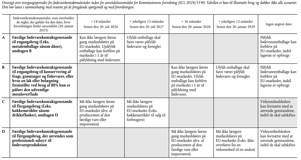Vejledningen indeholder følgende tabel med overgangsperioder og anvendelsesdatoer for relevante fødevarekontaktmaterialer: